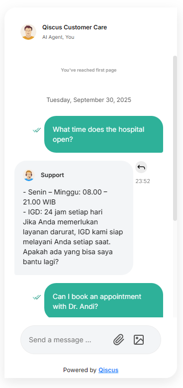 Result: Patients can self-book without calling or waiting in line, and staff instantly receive the booking in Qiscus Omnichannel or connected systems.