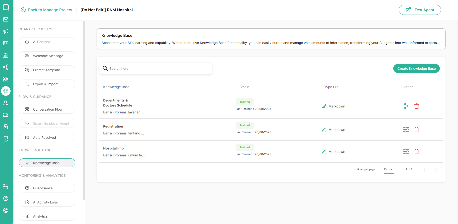 Upload or connect healthcare details for accurate answers. Reference: https://documentation.qiscus.com/agentlabs/knowledge-base